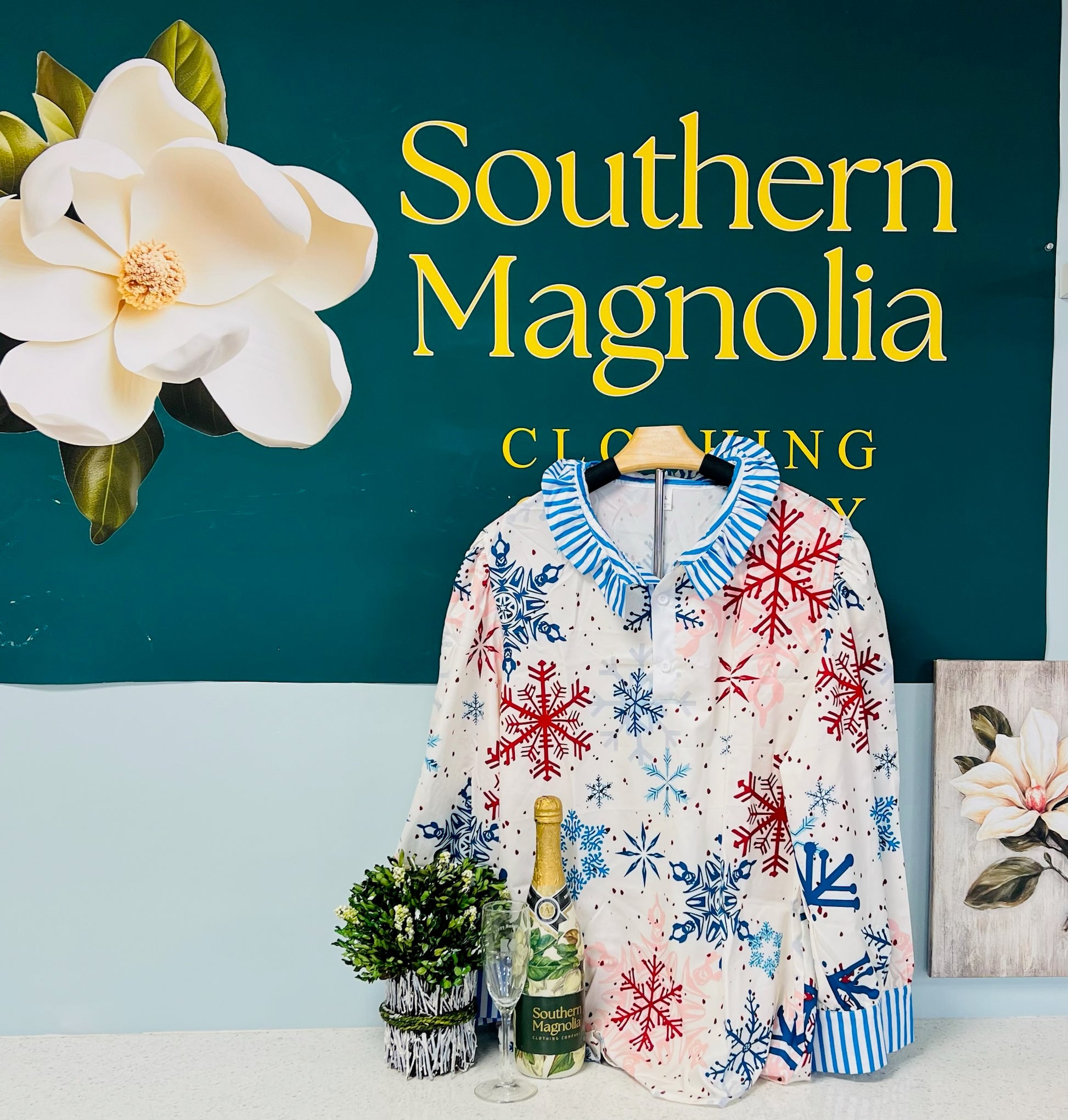 Celebrate the season in style with this playful Christmas Snowflake Blouse. Featuring delicate snowflake patterns, it brings holiday cheer to any outfit. Soft and comfy, it’s perfect for festive gatherings or cozy days by the fire. Add a touch of winter magic to your wardrobe with this charming blouse.