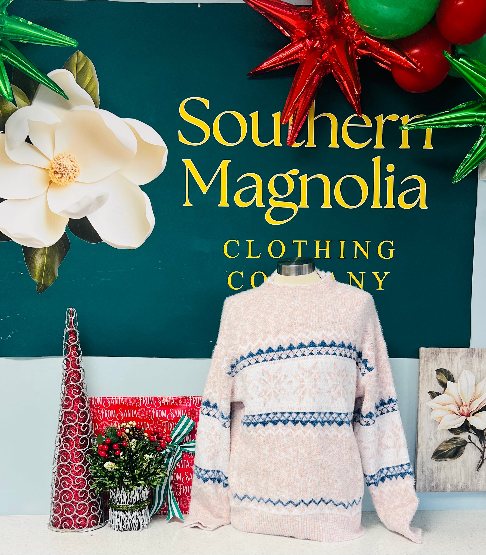 Wrap yourself in holiday cheer with this charming pink knit sweater, featuring delicate snowflake patterns that capture the magic of winter. The semi-high neckline offers cozy comfort while keeping things stylish and modern. Perfect for festive gatherings, casual outings, or those moments when you want to spread seasonal joy. Soft, warm, and undeniably cute—this sweater is your new holiday essential that works beautifully from Thanksgiving through New Year's.