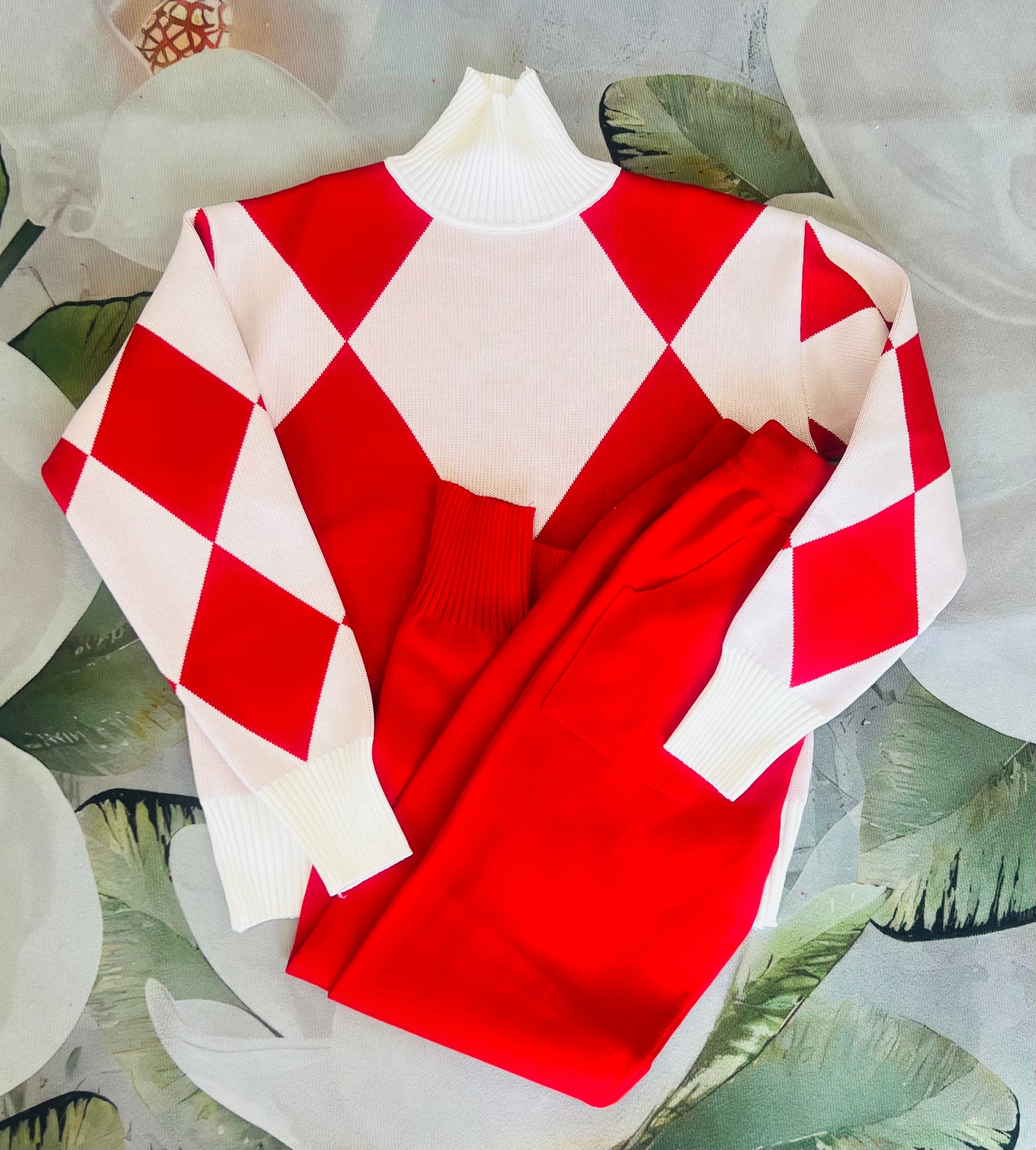 Bring a burst of fun to your wardrobe with this vibrant red checkered sweater paired perfectly with matching red pants. The playful pattern adds a touch of personality, while the coordinated set keeps your look effortlessly stylish. Cozy and bold, this outfit is ideal for those who love to stand out with a cheerful, confident flair.