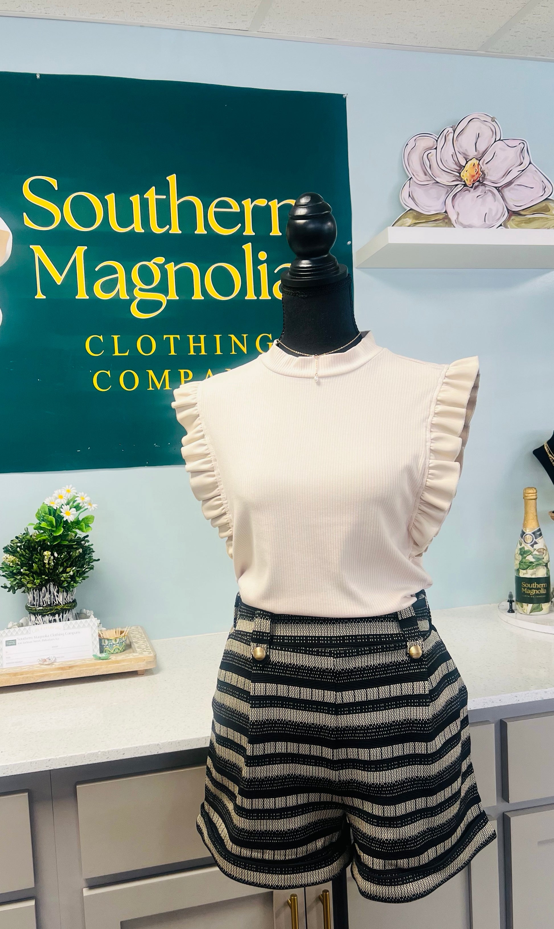 Step into sunny days with these Striped Textured Knit Shorts featuring charming gold buttons. Their playful stripes and cozy knit texture bring fun and comfort together, while the shiny buttons add a touch of sparkle to your casual look. Perfect for lounging or light adventures, these shorts keep you cool and stylish all day long.